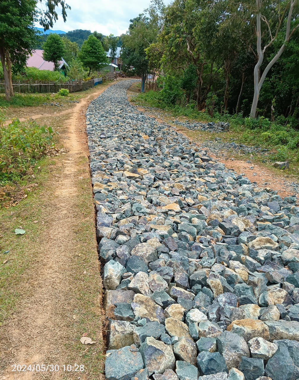 Panjang Jalan 1000 meter dan Lebar 3 meter total Volume 3000 meter, dengan anggaran Rp- 312.152.600 Dana Desa ( DD ) tahun 2024. Adapun material yang dipakai di lokasi tersebut adalah batu Gunung yang disusun hingga rapi.
