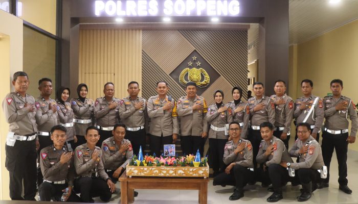 Acara Syukuran HUT Lalu Lintas Bhayangkara Ke-69 yang mengusung tema “Polantas Presisi Hadir Menuju Indonesia Maju” berlangsung dengan khidmat dan dihadiri oleh Kapolres Soppeng  AKBP Dr H. Muhammad Yusuf Usman SH., SIK., MT., CIPA Wakapolres AKBP H. Muhiddin Yunus SH., MH., dan Personil Satuan Lalu Lintas (Sat Lantas).