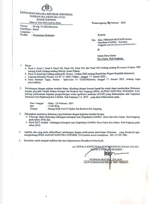 Watansoppeng, 25 Februari 2025 Centerinvestigasi.id – Polres Soppeng mengeluarkan surat panggilan terhadap Ketua Kelompok Tani Sipakatuo, Firman Mutaon, beserta Sekretaris dan Bendahara kelompok. Pemanggilan ini tertuang dalam surat bernomor B/119/II/2025/Reskrim, yang dibuat pada 24 Februari 2025, berkaitan dengan permintaan dokumen kelompok tani sejak tahun 2010. Rabu ( 26/02 ).