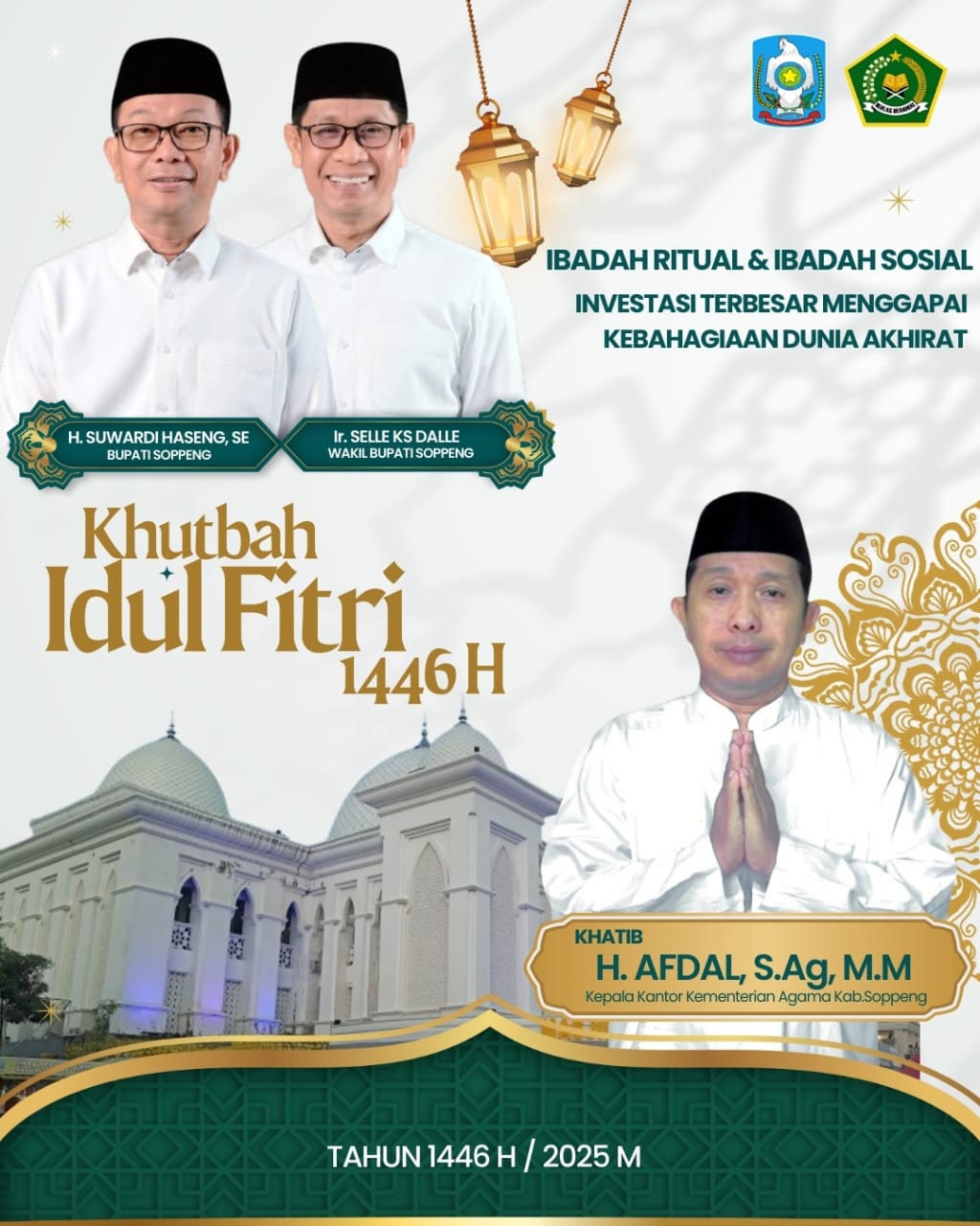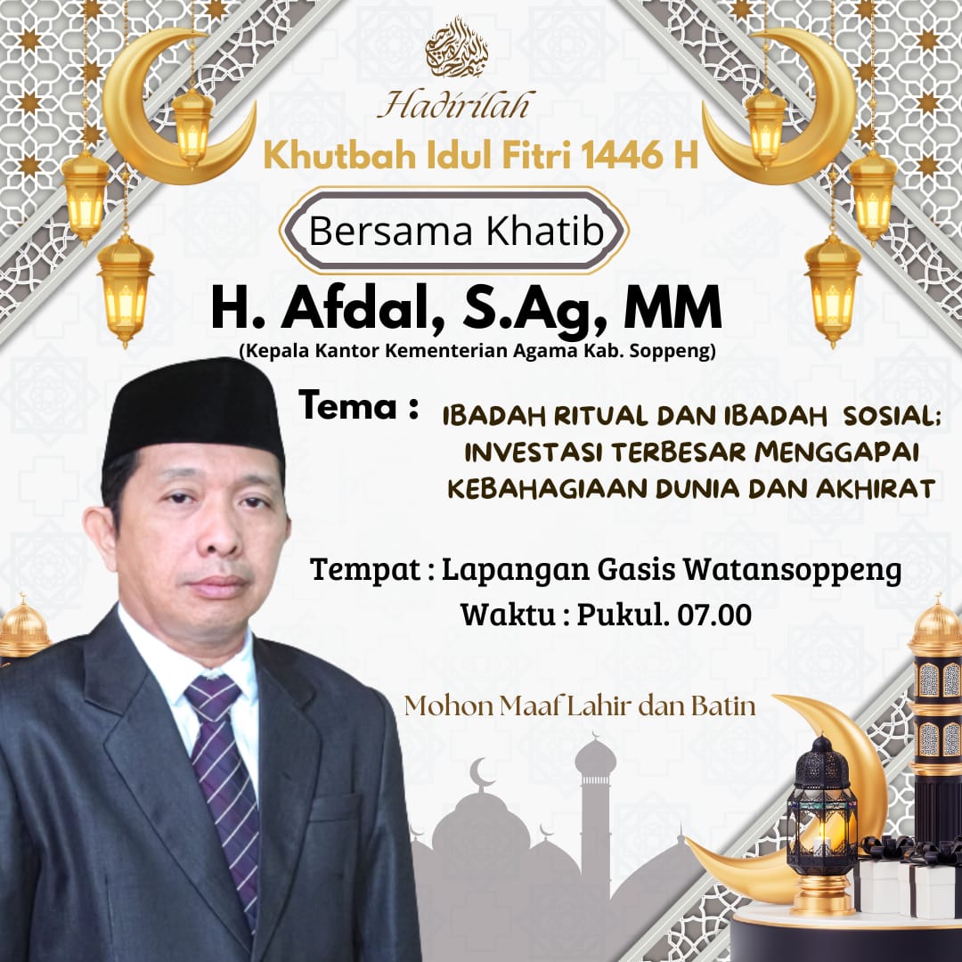 Watansoppeng, Centerinvestigasi.id – Kepala Kantor Kementerian Agama Kabupaten Soppeng, H. Afdal, S.Ag., M.M., menjadi khatib pada pelaksanaan Sholat Idul Fitri 1446 H yang digelar di Lapangan Gasis Watansoppeng, Senin (31/03/2025) pagi. Ribuan masyarakat Soppeng turut serta dalam ibadah ini.