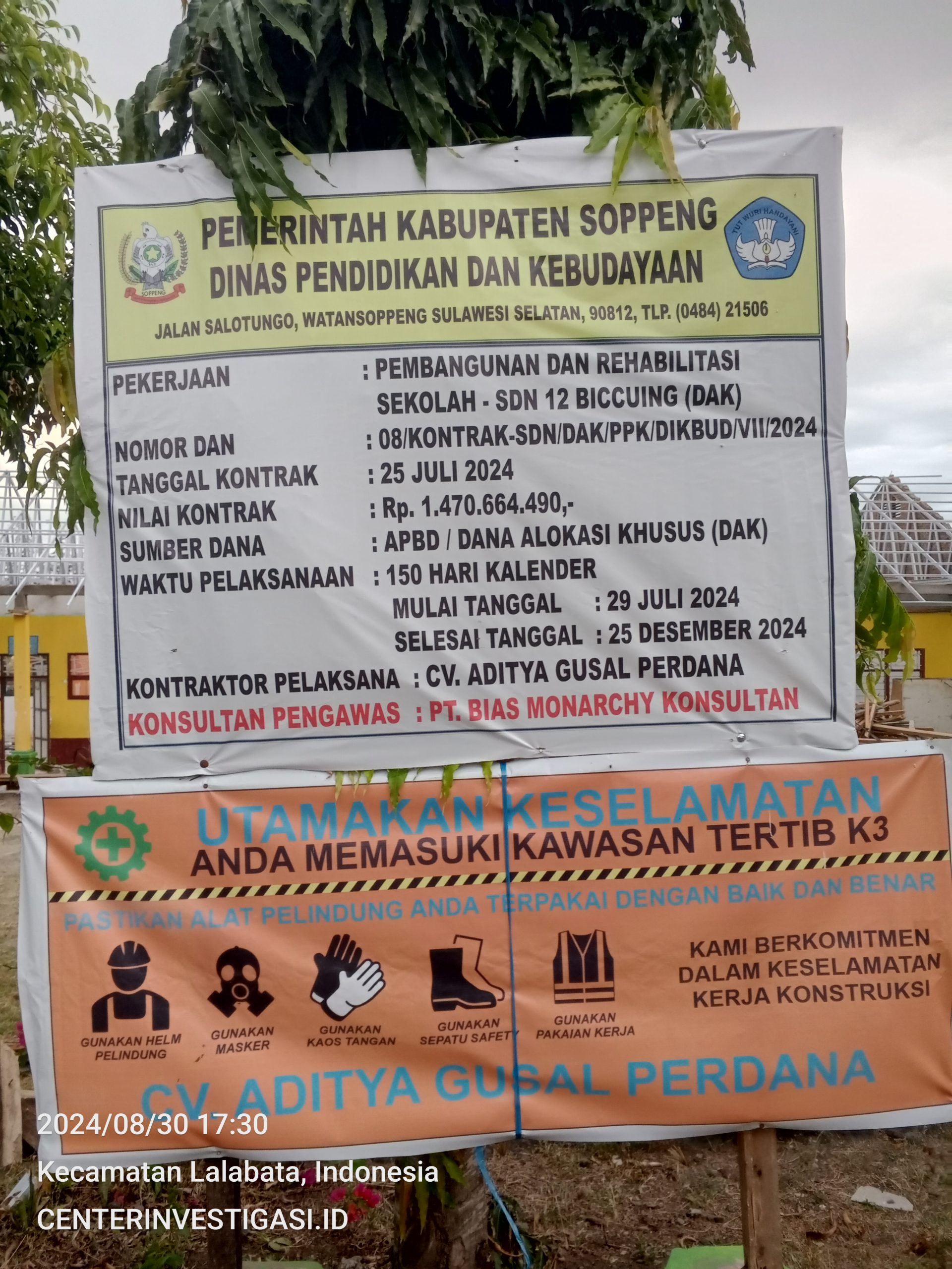 Proyek yang bersumber dari Dana Alokasi Khusus (DAK) tahun anggaran 2024 tersebut tercatat memiliki nilai kontrak sebesar Rp1.470.664.490,-. Pekerjaan dilaksanakan oleh CV. Aditya Gusal Perdana dan diawasi oleh PT. Bias Monarchy Konsultan, dengan masa pelaksanaan selama 150 hari kalender, terhitung sejak 29 Juli hingga 25 Desember 2024.