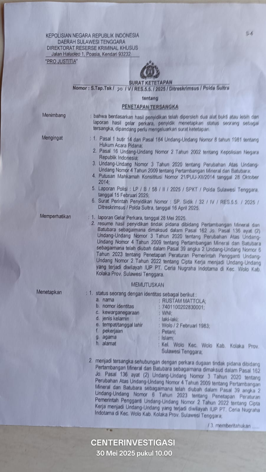 Rustam Mattola yang dikenal sebagai petani lokal menerima panggilan terkait dugaan tindak pidana di bidang pertambangan minerba. Berdasarkan Surat panggilan Ke 1, ia dimintai hadir pada 3 Juni 2025 untuk dimintai keterangan dalam perkara yang disangkakan melanggar Pasal 162 jo Pasal 136 ayat (2) Undang-Undang Nomor 3 Tahun 2020 atas perubahan Undang-undang Nomor 4 Tahun 2009,tentang Pertambangan Mineral dan Batubara.sebagai mana telah di ubah dalam pasal 39 angka 2 undang -undang nomor 6 tahun 2003 tentang penetapan peraturan pemerintah pengganti undang-undang Nomor 2 tahun 2002 tentang cipta kerja.