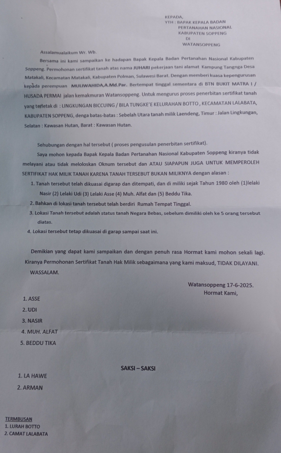 > “Kami menemukan surat itu di kantor Lurah Botto. Anehnya, meski mencantumkan nama lima warga dan dua saksi, surat itu tidak ditandatangani oleh satu pun dari mereka. Ini menimbulkan pertanyaan besar soal validitas dan siapa yang sebenarnya membuat surat tersebut,” ujar Ketua LSM-BPPI kepada wartawan Centerinvestigasi.id.