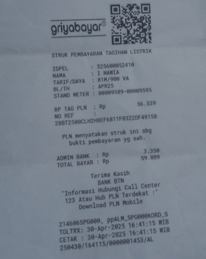 Mawardi juga menunjukkan bukti pembayaran terakhir berupa struk pembayaran tagihan listrik periode Maret 2025, yang dibayarkan pada 30 April 2025 pukul 15.15 WITA, melalui layanan Griyabayar dengan total pembayaran sebesar Rp59.039. Bukti tersebut mencantumkan nama pelanggan: INAWIA, dengan ID pelanggan 325806852418.