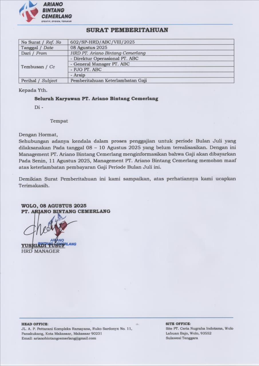Hingga berita ini diturunkan, manajemen PT ABC maupun PT CNI belum memberikan keterangan resmi terkait keterlambatan pembayaran tersebut.