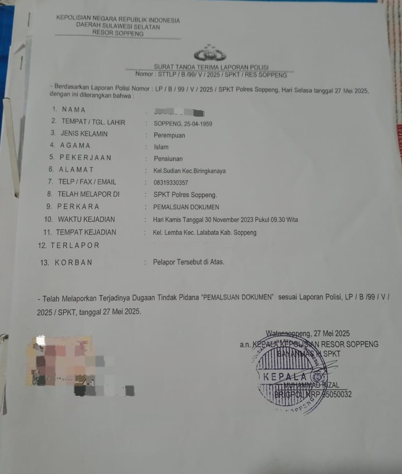 WATANSOPPENG, Centerinvestigasi.id – Pertemuan mediasi antara pelapor dan terlapor terkait surat laporan pengaduan dugaan pemalsuan dokumen yang teregistrasi dengan Nomor: STTLP/B/99/V/2025/SPKT/RES SOPPENG, gagal mencapai titik temu. Laporan tersebut diajukan oleh S.D., seorang pensiunan, terhadap A.A.S. terkait dugaan pemalsuan dokumen yang terjadi pada bulan November saat mediasi di Kelurahan Lemba, hingga ditingkat Kecamatan Lalabata, Kabupaten Soppeng.Pada 30 November 2023.