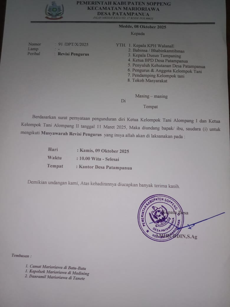 Undangan resmi bernomor 91/DPT/X/2025 tertanggal 8 Oktober 2025 tersebut diterbitkan oleh Pemerintah Desa Patampanua sebagai tindak lanjut dari surat pernyataan pengunduran diri Ketua Kelompok Tani Alompang I dan Ketua Kelompok Tani Alompang II tertanggal 11 Maret 2025.