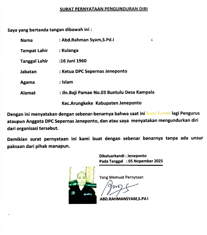 Berdasarkan dokumen resmi yang diterima redaksi, Abd. Rahman Syam, S.Pd.I, melalui Surat Pernyataan Pengunduran Diri tertanggal 5 November 2025, menyatakan bahwa dirinya tidak lagi menjadi pengurus ataupun anggota DPC SEPERNAS Jeneponto, dan menyatakan mengundurkan diri tanpa adanya paksaan dari pihak mana pun.