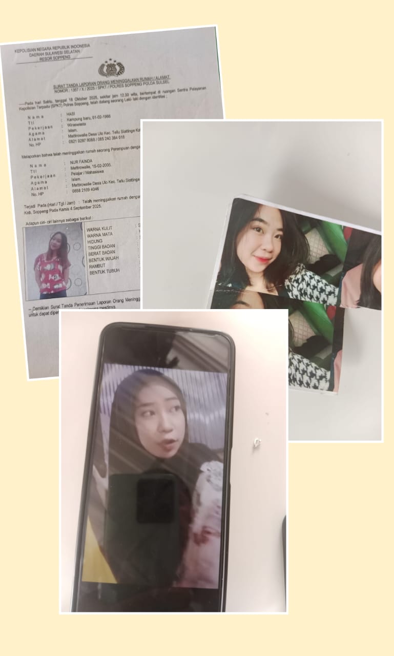 Pelapor, Hasi, menyampaikan bahwa Nur Fainda meninggalkan rumah sejak 4 September 2025 dari kediamannya di BTN Salotaro, Kecamatan Lilirilau, Kabupaten Soppeng.
