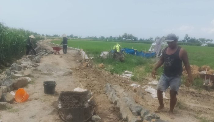 Selain itu, pekerja proyek terlihat memasang batu kali tanpa struktur kaki bawah yang memadai. Kondisi tersebut dikhawatirkan membuat talut tidak mampu menahan beban timbunan sehingga berpotensi membahayakan warga sekitar jika terjadi pergeseran tanah atau longsoran.