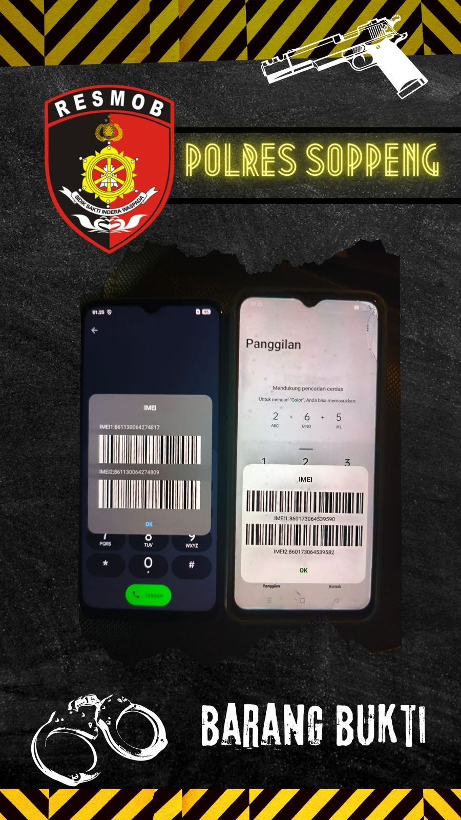 Dari tangan para pelaku, petugas mengamankan dua unit telepon genggam yang diduga merupakan hasil kejahatan. Berdasarkan pemeriksaan awal, kedua pelaku mengakui perbuatannya dan saat ini telah diamankan di Mapolres Soppeng untuk menjalani proses penyidikan lebih lanjut.