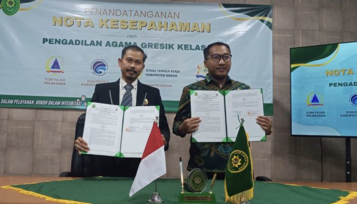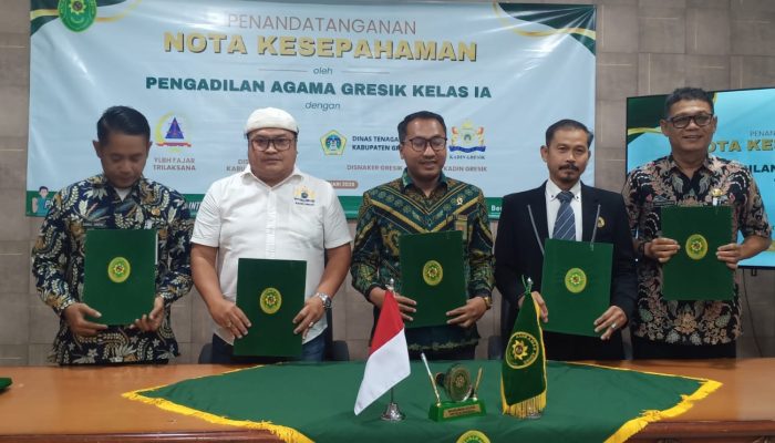 GRESIK,Centerinvestigasi.id – Pengadilan Agama (PA) Kelas IA Gresik kembali menegaskan komitmennya dalam memperluas akses keadilan bagi masyarakat dengan menandatangani nota kesepahaman (MoU) bersama YLBH Fajar Trilaksana (FT), Dinas Komunikasi dan Informatika (Diskominfo), Dinas Tenaga Kerja (Disnaker), serta Kamar Dagang dan Industri (Kadin) Gresik, Kamis (15/1/2026).