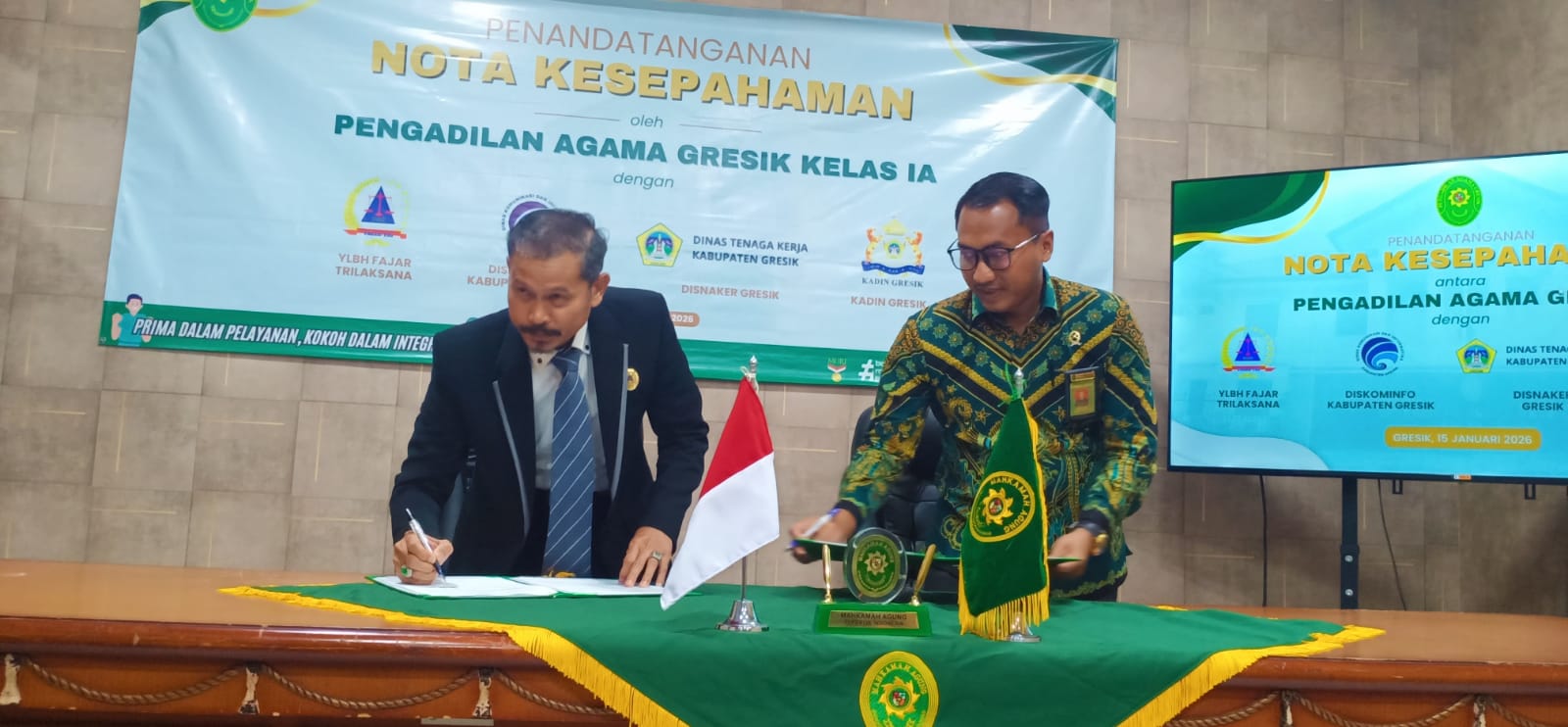 MoU ditandatangani Ketua PA Kelas IA Gresik Ahmad Zaenal Fanani, Direktur YLBH FT Andi Fajar Yulianto, Kepala Diskominfo Gresik Johar Gunawan, Kepala Disnaker Gresik Zainul Arifin, serta Wakil Ketua Kadin Gresik Nefa Indra Lesmana.