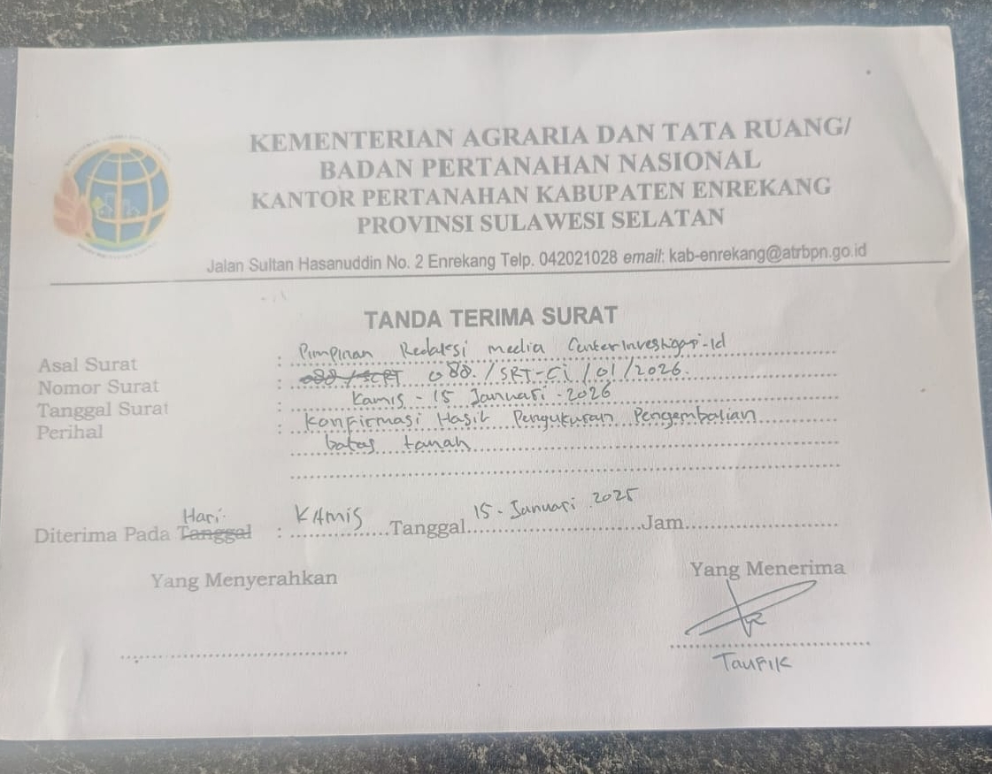 Tidak berhenti di situ, Pimpinan Redaksi CENTERINVESTIGASI.ID kembali menyurati BPN Enrekang dengan mengantarkan langsung surat konfirmasi ke kantor BPN Enrekang pada Kamis, 15 Januari 2026, yang diterima langsung oleh pihak BPN Enrekang.