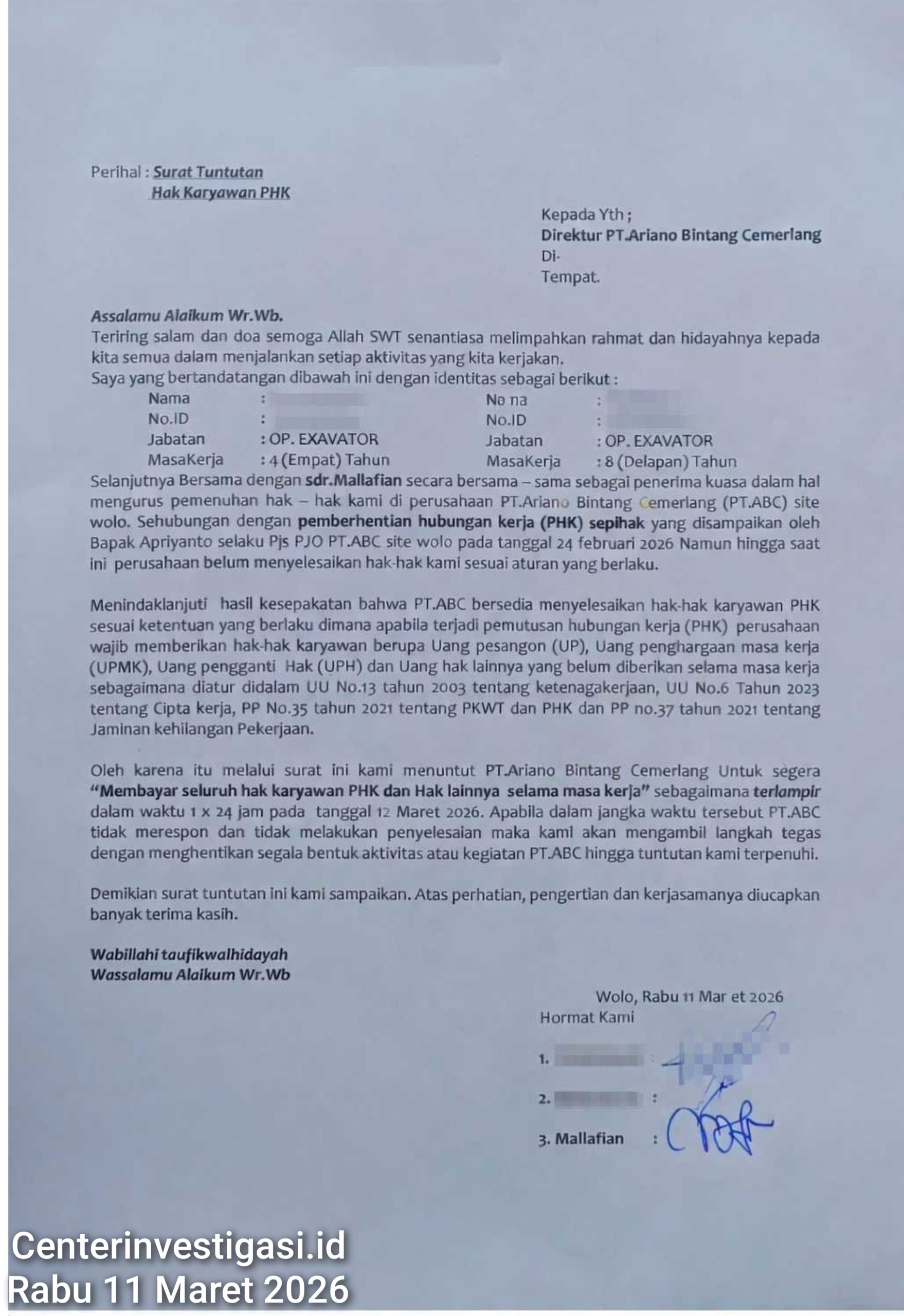 Kolaka, Centerinvestigasi.id – Rabu, 11 Maret 2026 – Dua mantan karyawan PT Ariano Bintang Cemerlang (PT ABC) Site Wolo, Kabupaten Kolaka, secara resmi melayangkan surat tuntutan penyelesaian hak-hak pasca Pemutusan Hubungan Kerja (PHK) kepada manajemen perusahaan.