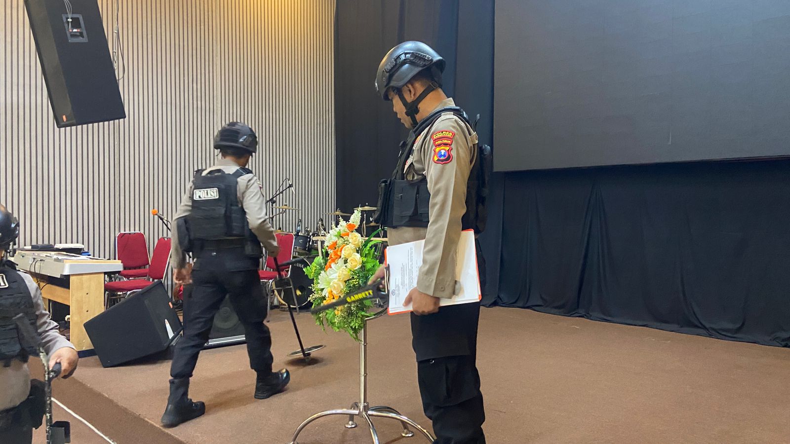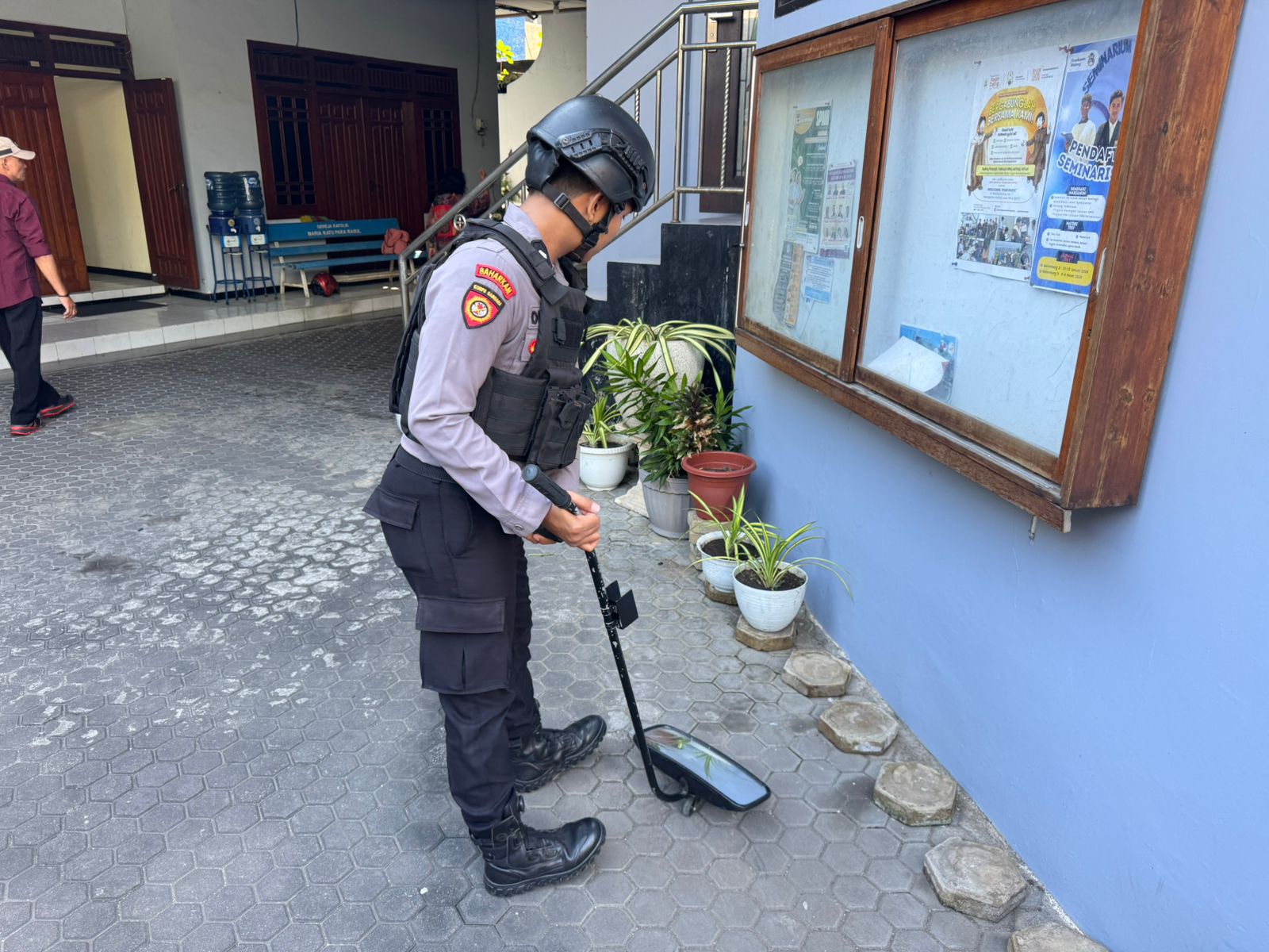 ​Personel Sat Samapta menyisir setiap sudut area rumah ibadah untuk memastikan tidak ada benda mencurigakan maupun ancaman keamanan lainnya.