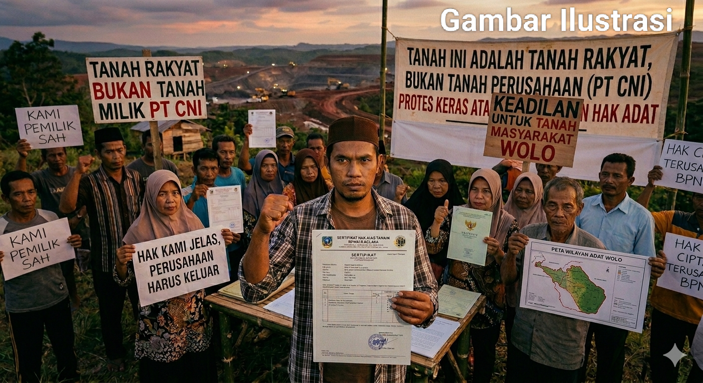 KOLAKA ,Centerinvestigasi.id 16 April 2026– Masyarakat Kecamatan Wolo menyampaikan keprihatinan atas praktik yang mensyaratkan rekomendasi dari PT Ceria Nugraha Indotama (CNI) dalam proses pengurusan Sertifikat Hak Milik (SHM). Ketentuan tersebut dinilai menimbulkan ketidakpastian hukum dan berpotensi tidak sejalan dengan regulasi pertanahan yang berlaku secara nasional.