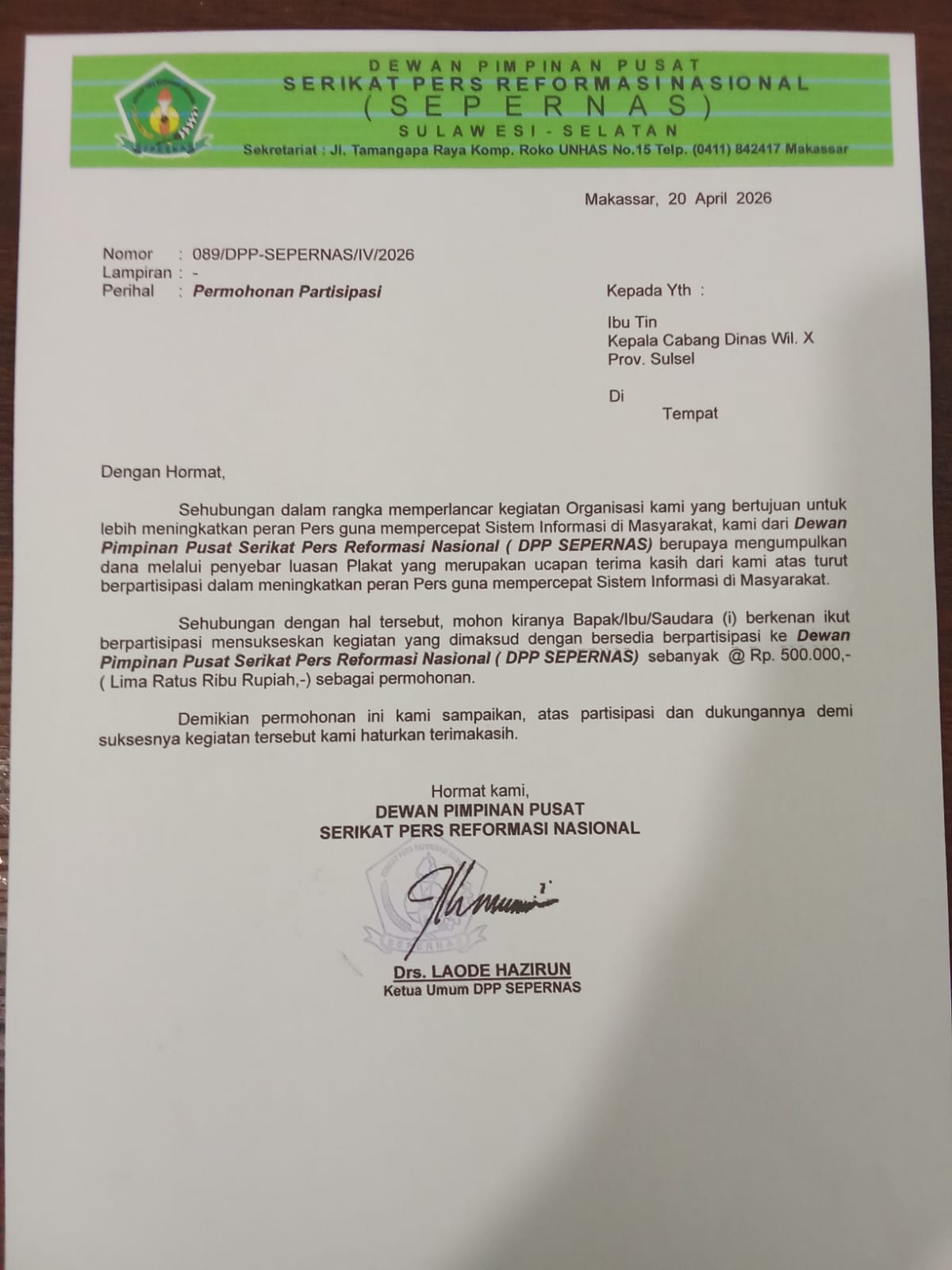 Surat bernomor 089/DPP-SEPERNAS/IV/2026 tertanggal 20 April 2026 itu berisi permohonan partisipasi dana sebesar Rp500.000 dengan dalih mendukung kegiatan organisasi.