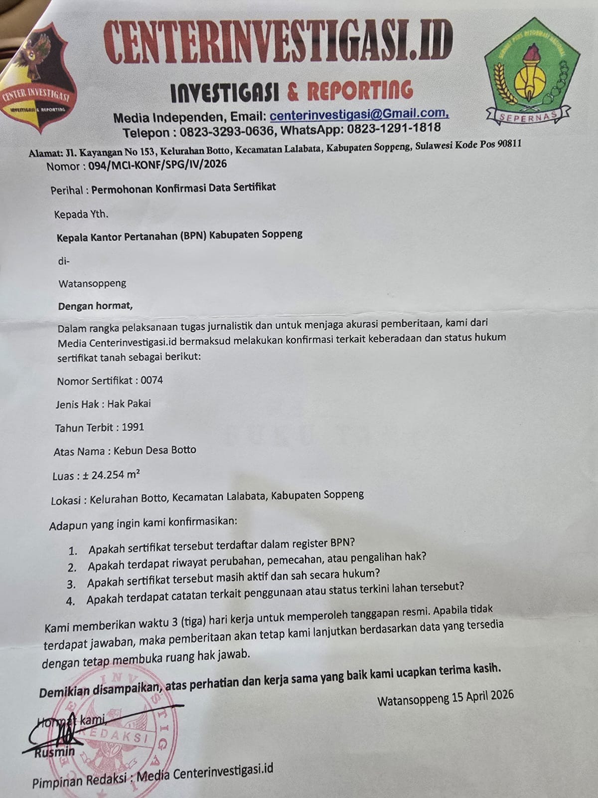 Soppeng, Centerinvestigasi.id, 24 April 2026 – Meski batas waktu tanggapan telah terlampaui, pihak Kantor Pertanahan (BPN) Kabupaten Soppeng akhirnya memberikan respon awal terkait surat konfirmasi yang dilayangkan oleh Media Centerinvestigasi.id mengenai status lahan Kebun Desa Botto.