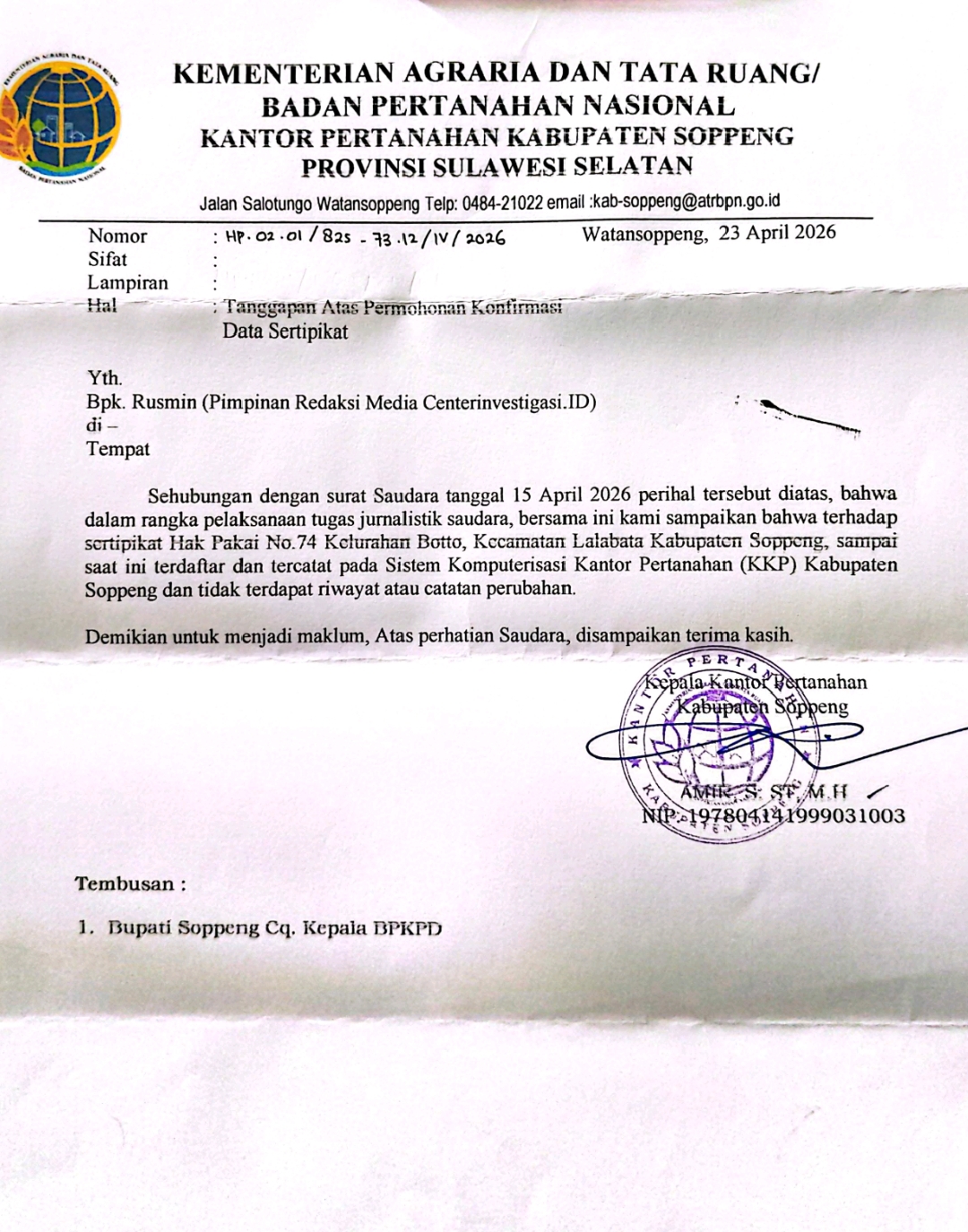 Dalam surat tertanggal 23 April 2026 yang diterima redaksi pada Senin (27/04/2026), BPN Kabupaten Soppeng menyampaikan bahwa sertifikat Hak Pakai Nomor 74 yang berlokasi di Kelurahan Botto, Kecamatan Lalabata, hingga saat ini masih terdaftar secara resmi.